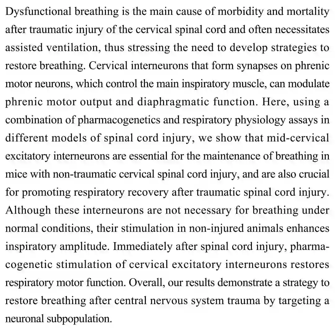 (导读 柳寒石)呼吸功能失调是颈髓损伤后发病和死亡的主要原因。研究人员在不同的脊髓损伤模型中发现中颈髓兴奋性中间神经元对于维持非创伤性颈脊髓损伤小鼠的呼吸,和促进创伤性脊髓损伤后的呼吸恢复至关重要。脊髓损伤后,对颈髓兴奋性中间神经元进行药物遗传学刺激能够立即恢复呼吸功能。该结果揭示了通过靶向神经元亚群来恢复中枢神经系统创伤后呼吸的新策略。