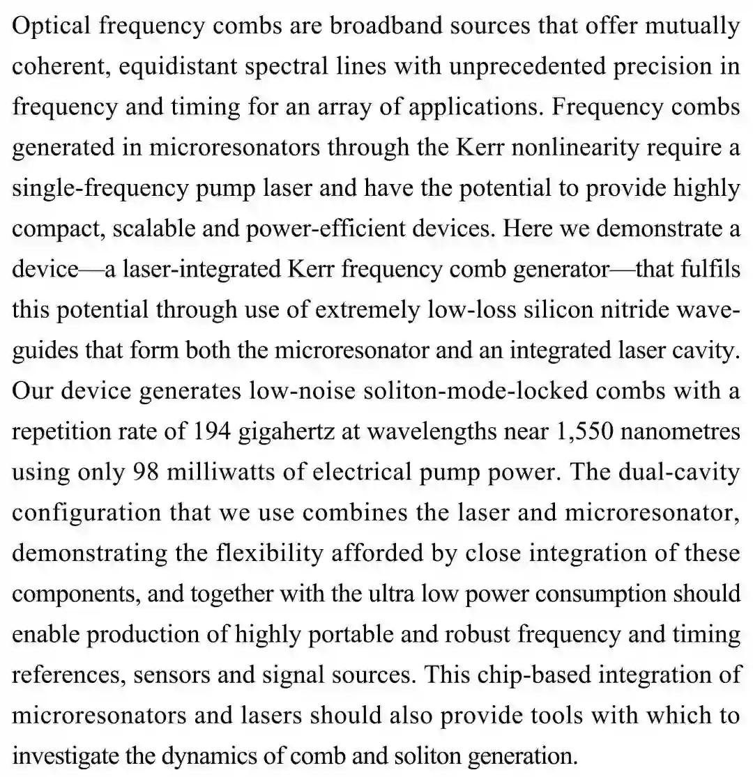 (导读 阿金)光频梳可提供相干等距光谱线,具有前所未有的频率和时间精度。本研究研制出一种激光集成克尔频率梳发生器,通过损耗极低的氮化硅波导形成微谐振器和激光集成空腔。该器件可以98毫瓦的电泵功率产生低噪声的孤子模式锁定梳。双空腔的设计表现出高度灵活性、低功耗、高度便携且稳健的频率和定时基准等优势。有望成为研究频率梳动力学和孤子生成的有效工具。