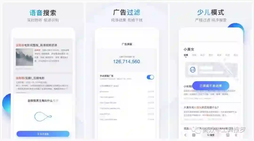 它支持文字搜索,语音搜索,图像搜索。同时还能过滤广告,页面加载更快速。