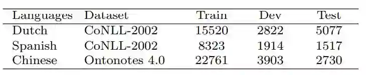 我们在西班牙语、荷兰语和中文上进行实验,其语料如下表2所示