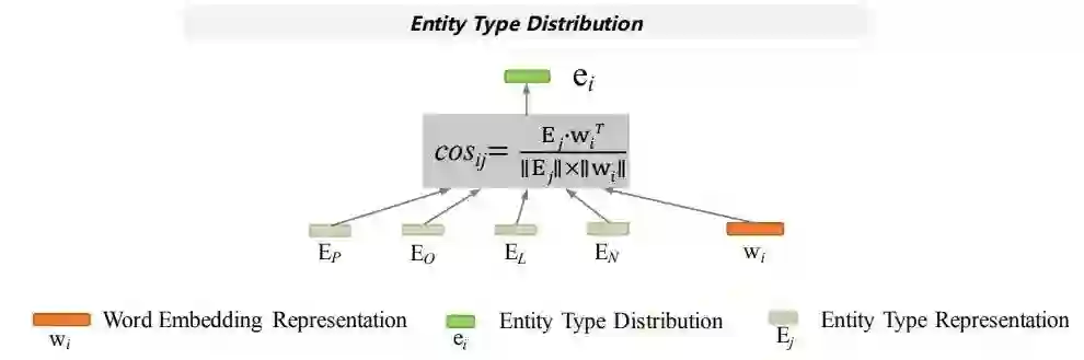 在本节中我们将介绍如何学习词汇的实体分布特征,该特征可以理解为某一词汇成为某一实体的可能性,该特征是一种语言无关的特征,因此我们可以从目标语言和辅助语言两个空间进行学习。并且该特征可以一定程度上帮助我们去进行实体识别,因为通过向量化的词汇表示其可以自然的去计算某一相似度,而且word embedding之间保持某些语义特性,例如我们对人名、地名和机构名各学习一个表示,则自然而然的知道 "Microsoft''距离机构的表示应该更近,而"Bill Gates''距离人的表示更近, 我们希望学习词汇的实体分布特征并将其用于实体识别模型中。具体计算过程如图5所示,