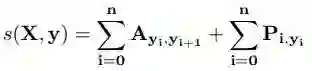 代表从标签i到标签j的转移概率。P是神经网络输出的得分,代表第i个词被标记为第