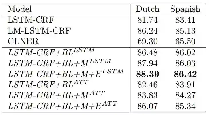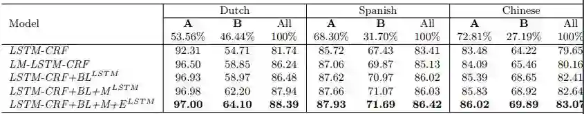 表 5: Comparison of the results for LSTM-CRF, LM-LSTM-CRF and our LSTM-based networks. A denotes the entities appearing in both training and test datasets, and B indicates all other cases. Evaluation metric is F measure