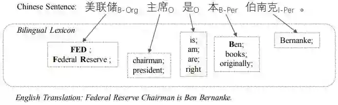 早期的研究人员指出,不同的语言间包含完整的实体语义线索。基于这一真实假设,本论文提出一种利用辅助语言的语义信息去提高目标语言实体识别结果的神经网络模型。特别地,本文通过利用不同语言间的翻译词典 (目标语言到辅助语言) 建立起了不同语言之间的桥梁,不仅可以进行语义层面的特征传递,还可以将实体类型分布特征进行有效的传输。例如,图1句子中的 “本” 字,虽然经常在 中文中使用,但是很少作为名字姓氏出现,因此模型在判断的过程中很难对其进行正确分类。然而 “本” 的英文翻译 “Ben” 却经常在英文中当作姓名出现,因此,如果在考虑“本” 的时候能同时考虑其英文语义将有助于模型进行判断。