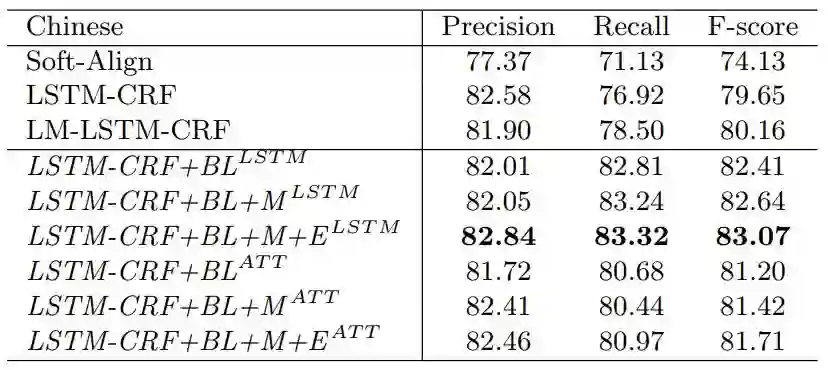 我们将自己所提的方法进行了不同的模型组合,其西班牙语和荷兰语结果如表3所示,中文结果如表4所示,均显示我们的方法获得了最好的效果。