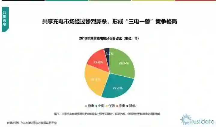 移动互联网大数据监测平台Trustdata在7月15日发布的《2019年中国共享充电行业发展分析简报》显示,在共享充电市场份额中,街电占比28.6%,小电占比27.0%,怪兽充电占比25.1%,来电占比15.6%。
