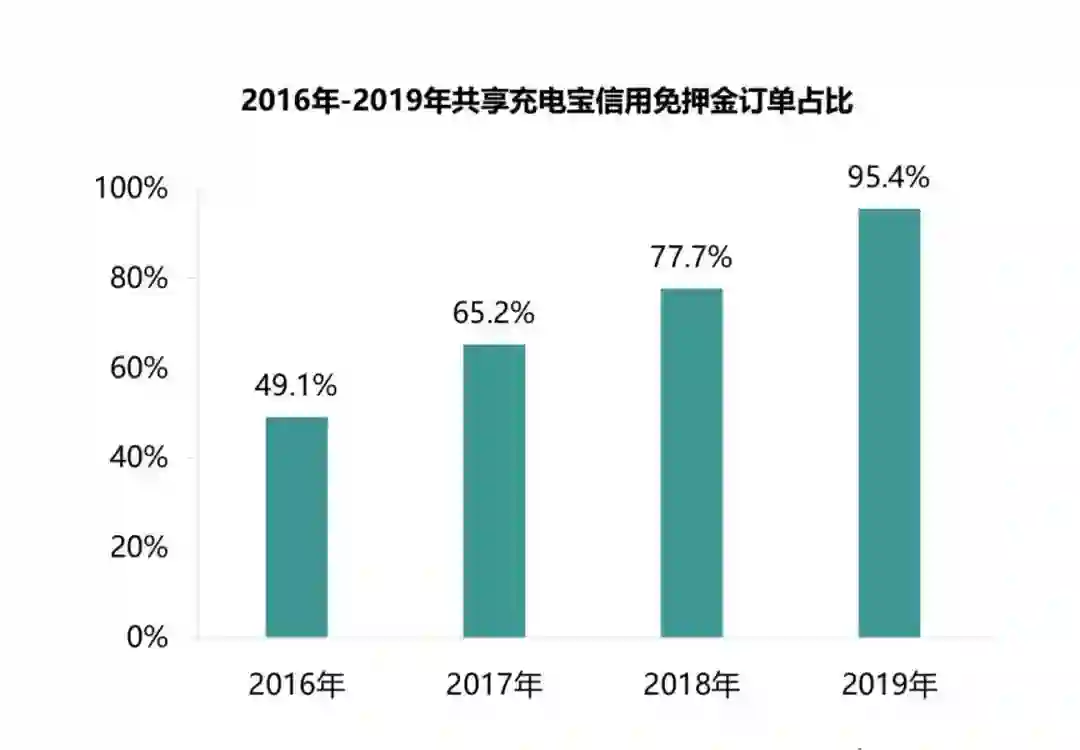 根据Trustdata在《2019年中国共享充电行业发展分析简报》中给出的数据,2019年共享充电宝信用免押金订单占比已达到95.4%。