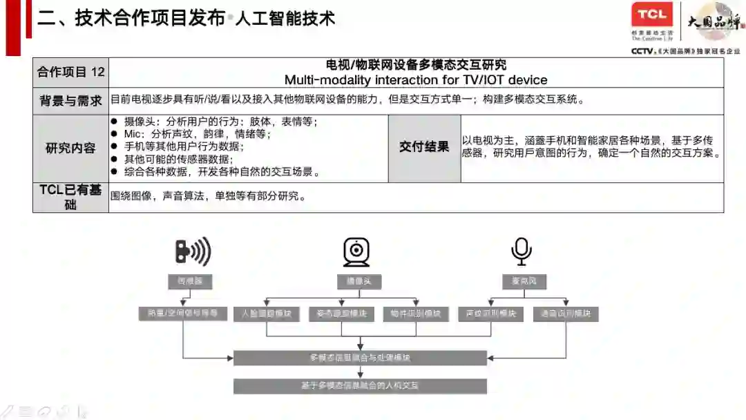 背景与需求:目前电视逐步具有听/说/看以及接入其他物联网设备的能力,但是交互方式单一;构建多模态交互系统。