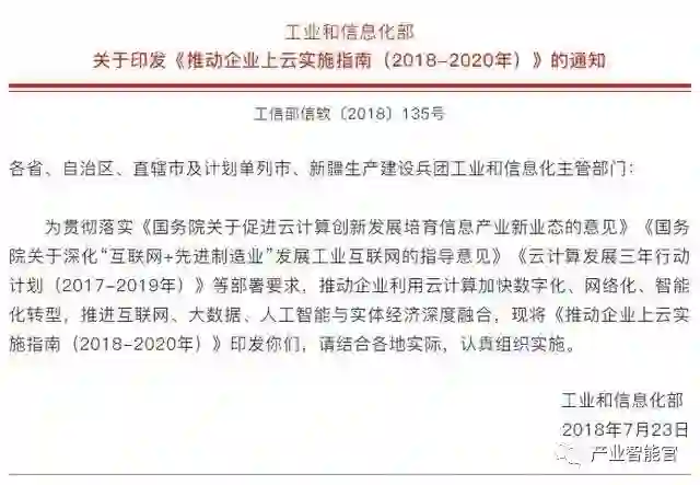 为贯彻落实《国务院关于促进云计算创新发展培育信息产业新业态的意见》《国务院关于深化“互联网+先进制造业”发展工业互联网的指导意见》《云计算发展三年行动计划(2017-2019年)》等部署要求,推动企业利用云计算加快数字化、网络化、智能化转型,推进互联网、大数据、人工智能与实体经济深度融合,现将《推动企业上云实施指南(2018-2020年)》印发你们,请结合各地实际,认真组织实施。