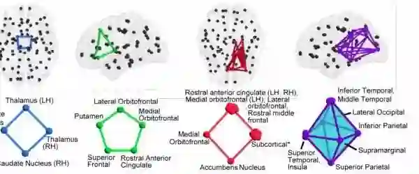 首先,它揭示了某些神经节群之间是“完全连接”的——意思是节群里的每个节点都和其他所有节点相连,整个节群组成一个叫做团的结构。所有和认知有关的系统都是由包括不同数量的节点的团组成的。