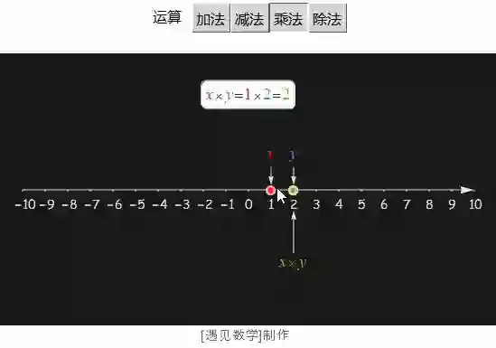 先来看看在实数轴上两个数的加减乘除这 4 种运算. 观察到红蓝两个点(数), 在不同的计算下, 其结果(绿点)的变化, 不管数怎样变化, 都总还落在数轴上(除法分母为 0 时候, 当然没有意义).