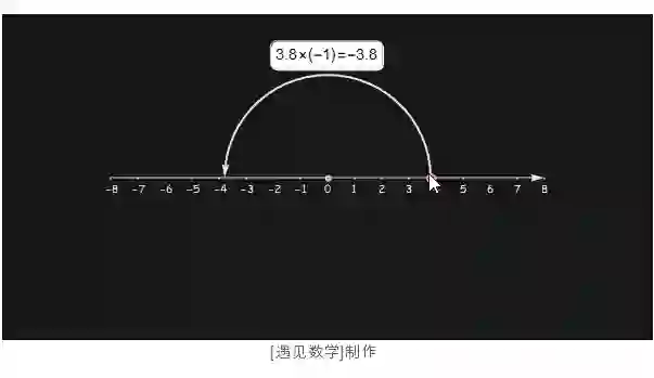 再来看下图中, 任何实数乘以 -1 的结果都会落在关于原点对称相应的位置上. 所以乘以 -1 的计算可以理解为该点(数)绕着原点旋转了半圈.
