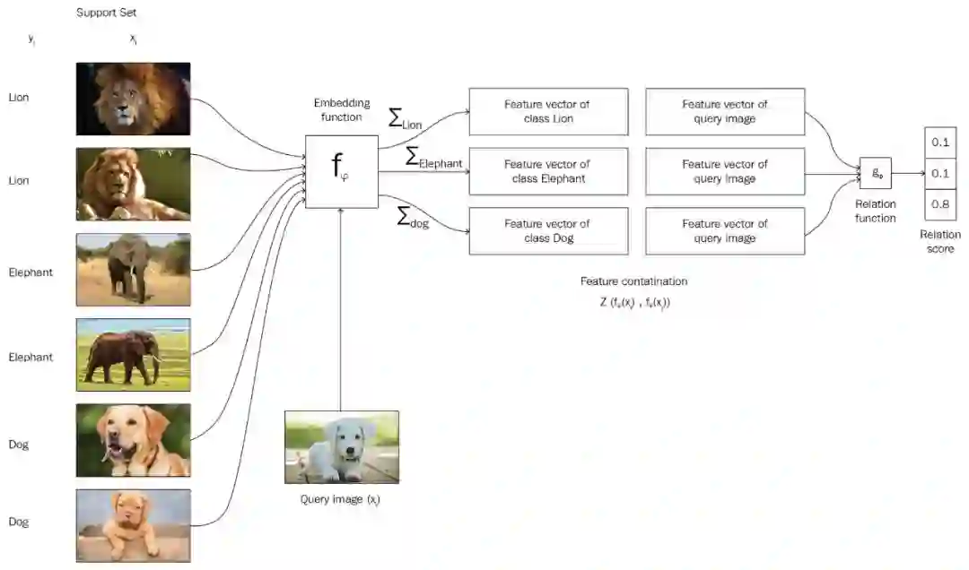 图 3:匹配网络的工作原理。支持集合中有狮子、大象和狗三类,而待分类的图片类别未知。通过嵌入函数将每一个类别(狮子、大象、狗和未知图片)转换为嵌入向量,并使用关系函数(如 Softmax)计算已知分类和未知分类的相似度。图片来自 Hands on Meta Learning with Python,chapter 4。