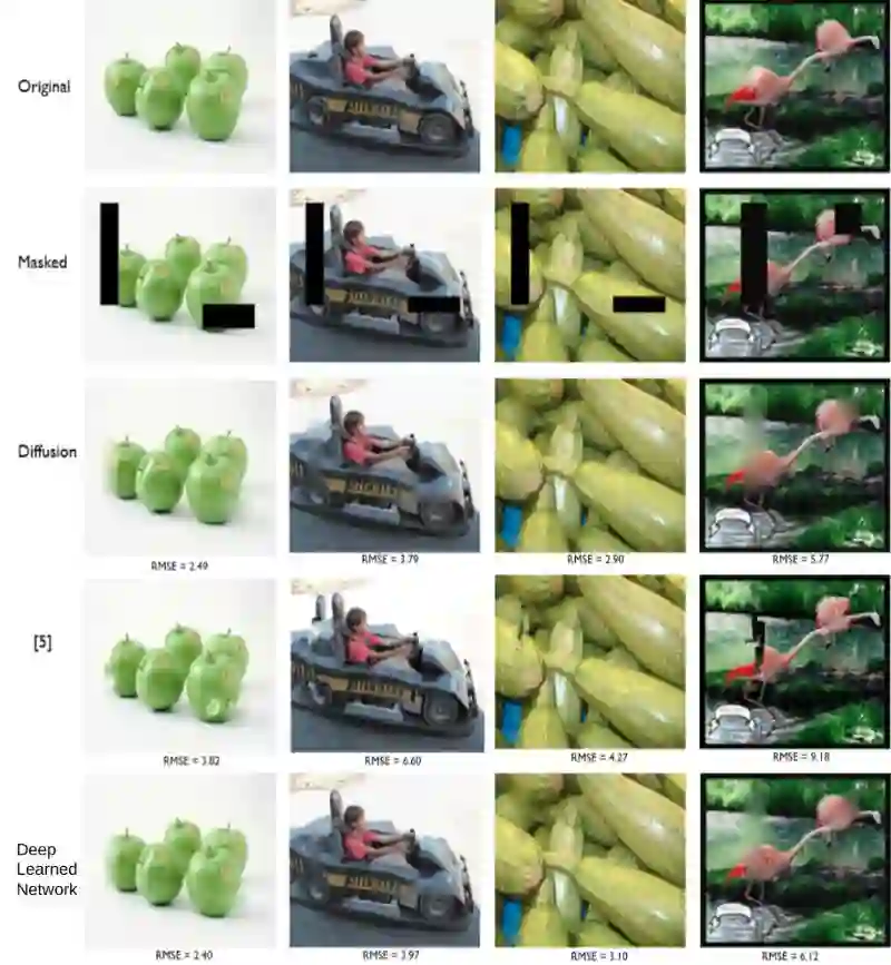 当缺失部分很大时,这些方法会失效,因此需要一个额外的部件提供合理的想象力(来自机器的幻觉)。这些附加的信息可能是由自然图像的高阶模型提供,例如由深度神经网络计算的那些。