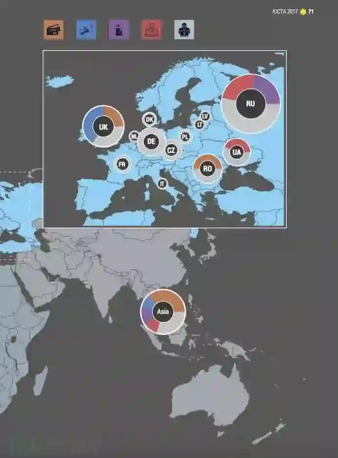 如果你是关注安全事件的积极分子,那么这份报告的干货其实并不算多,报告全文很长,总共分成[依赖于]网络[的]犯罪(cyber-dependent crime)、线上儿童色情内容、支付欺诈、线上犯罪市场、网络与恐怖主义(the convergence of cyber and terrorism)、剖析犯罪要素(cross-cutting crime factors),以及网络犯罪地理位置分布。