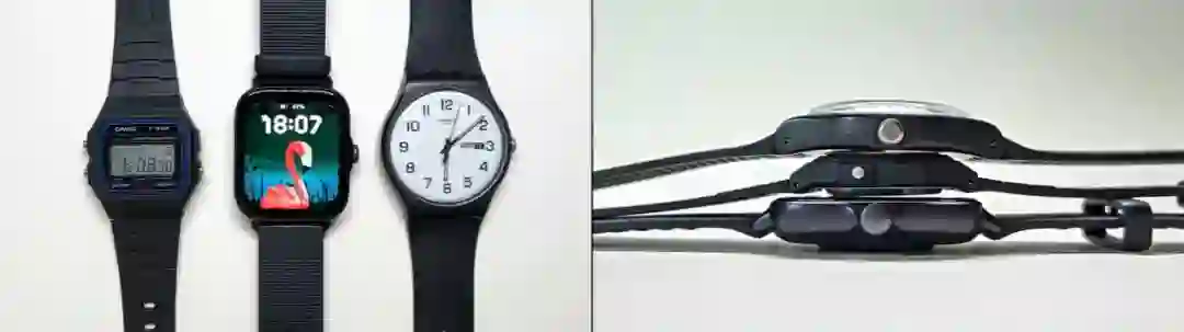 此前我也尝试过诸如智能手环、手表这样的设备,后来无一例外都出掉了。原因很简单:太大,或者太厚。首先,我的手腕不够粗,普通的「中性表」都只是刚好能戴;其次,手环也好、手表也好,塞了传感器之后都会多出一个平面凸台。如果手表本体厚,一方面很难让凸台贴合皮肤,影响测量;另一方面为了保持稳定需要额外绑紧腕带,给手腕带来额外的压迫。这就是为什么智能手表的佩戴感常常比普通手表更差——普通手表的背部曲线是贴合手腕的,而智能产品为了传感器贴合,必须反弓。
