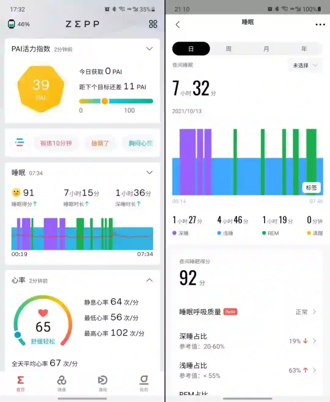 左:首页的快捷健康记录;右:夜间睡眠分析