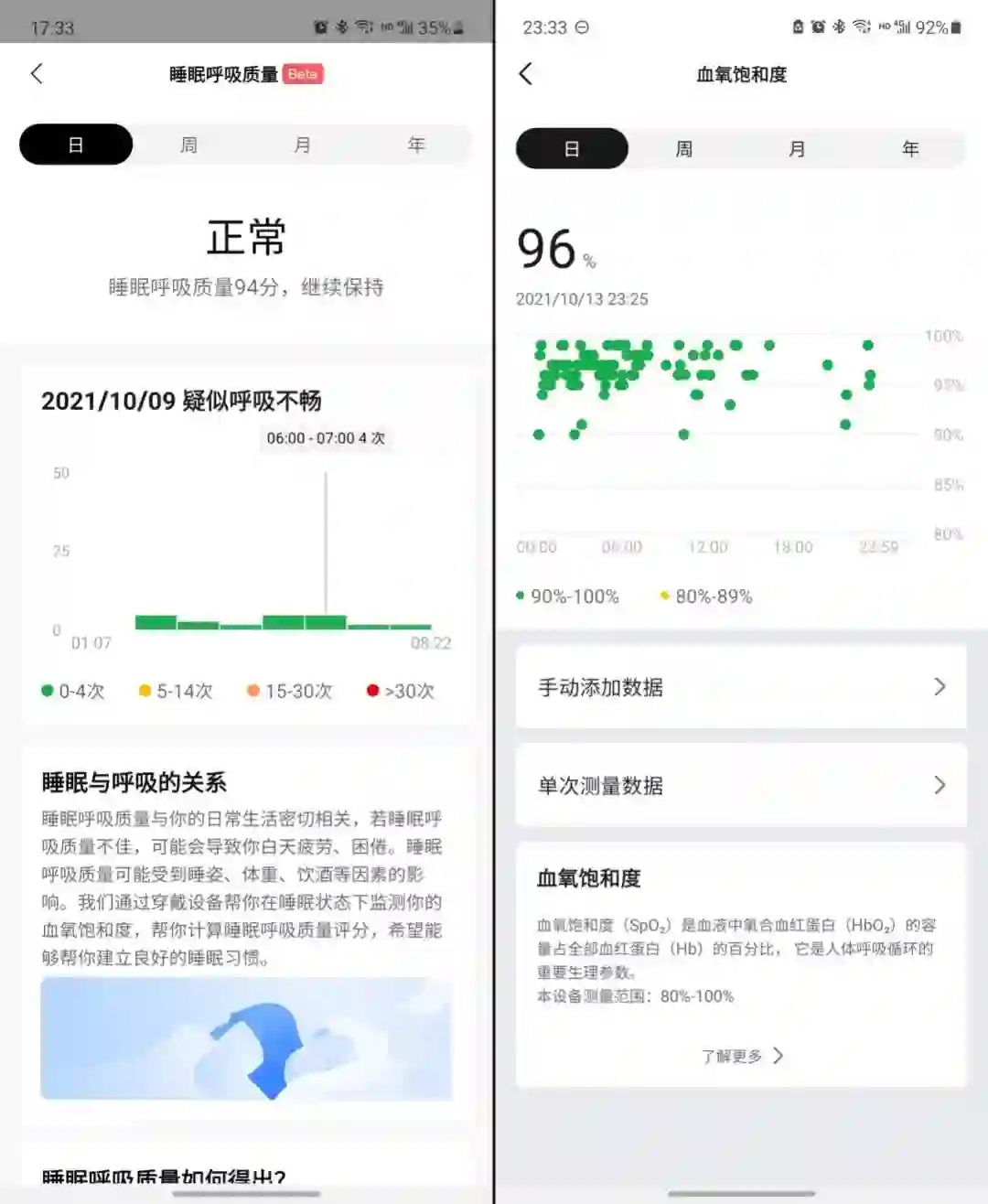 左:睡眠呼吸质量;右:血氧饱和度打点