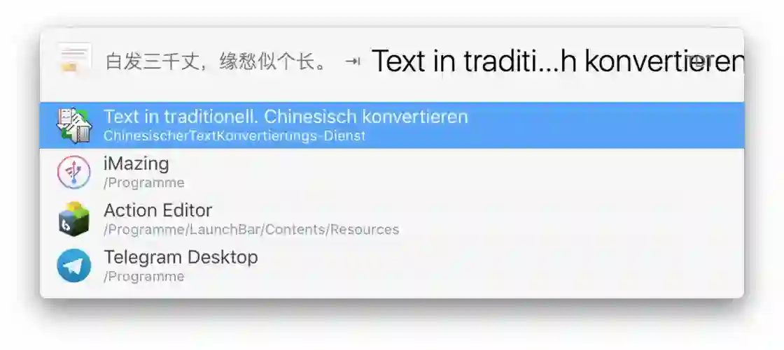 使用 LaunchBar 可以对剪贴板中的文本进行转换,例如,可以把简体字直接转换为繁体字: