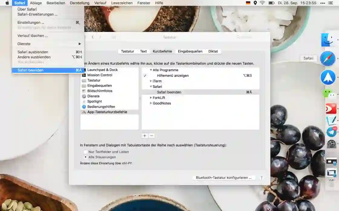但日常使用时我会让 Safari 常驻后台,因为每次关闭它后再重新启动都会等待几秒,让人不耐烦。为了避免手滑按下 ⌘ Q 直接把 Safari 关闭,我在系统设置中把关闭 Safari 的快捷键修改为了 ⌘ Ä。