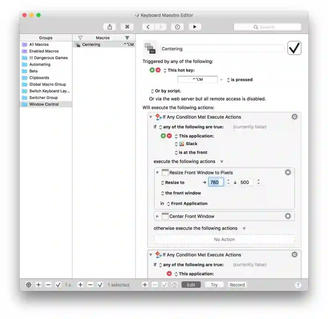 Keyboard Maestro 中调节个别软件窗口尺寸的 Macro