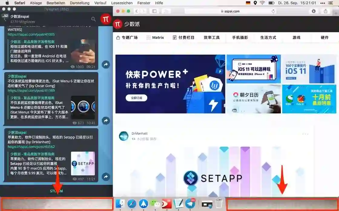 窗口的管理我用的是 Magnet,轻便简洁,通过快捷键 ⌃ ⌥ 与方向键或字母键组合,可以对窗口进行简单排列。但当遇到 Telegram,Slack 这样简单分配到屏幕一半会出现奇怪效果的软件: