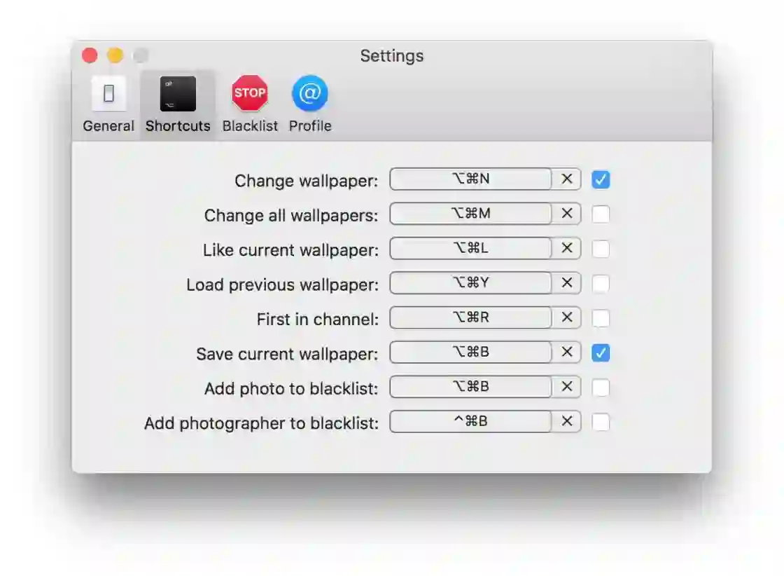 在这款软件中,我开启了两个快捷键,分别用于切换壁纸(⌥ ⌘ N)和保存当前壁纸(⌥ ⌘ B)。
