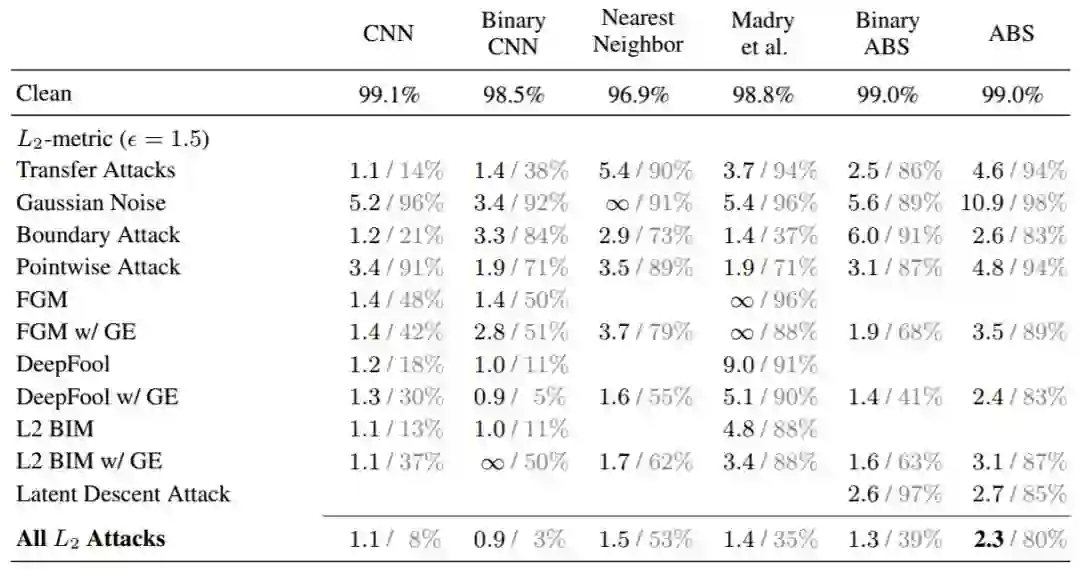 研究者在多种攻击类型上进行了防御方法的扩展实验评估,表明 ABS 模型能在 L_0、L_2、L_∞扰动上能超越当前最佳,并且对 ABS 有效的对抗攻击对于人类而言也具备语义含义。