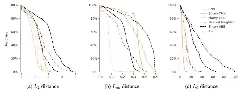 对每个模型和 L_p 范数,我们展示了随着对抗扰动尺度增加模型准确率降低的表现,如图 2 所示。在图(b)中我们能看到 Madry 等人的方法在 L_∞距离=0.3 的阈值内有很好的表现,而 Binary ABS 能达到 0.5 的阈值。