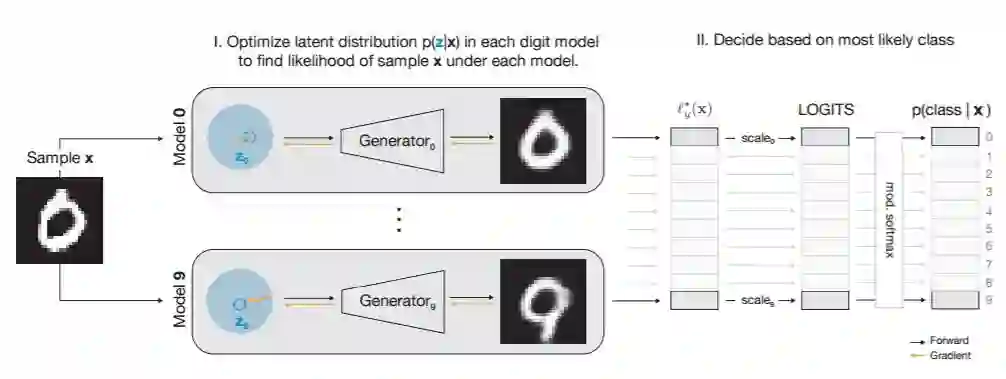 图 1:模型架构概览图。简单来说:I) 在隐藏空间执行梯度下降,对每个采样 x,我们计算出每个类别的对数似然度下界(ELBO);II) 类-条件(class-conditional)ELBO 的类依赖(class-dependent)标量权重构成了最终的分类预测。