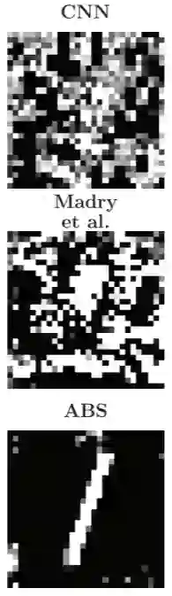 图 4:示例:CNN、Madry 方法和本文提出的 ABS 模型以超过 90% 准确率将图像分类为「1」。