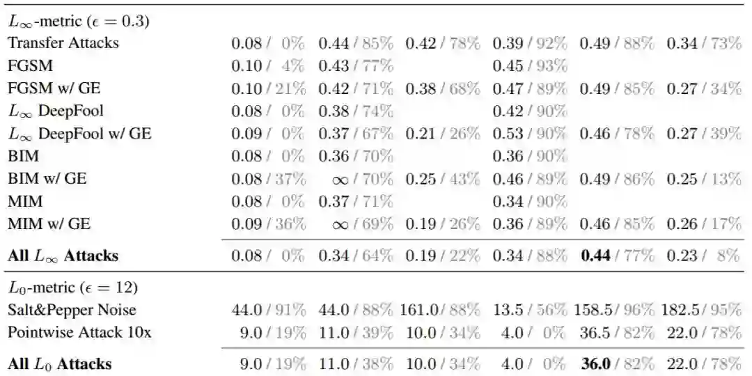 表 1:不同模型在不同对抗攻击和距离指标下的 MNIST 分类准确率结果。每一项展示了所有样本的中位数对抗距离(左值,黑体),以及模型在对抗扰动阈值(L_2 = 1.5、L_∞ = 0.3、L_0 = 12)下的分类准确率(右值,灰体)。「w/ GE」表示使用了数值梯度估计的攻击。