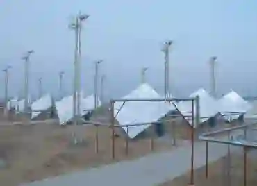 这种新型的陈式定日镜技术继承和吸收了"塔式"、"碟式"热发电技术中的"点聚焦"集热技术,同"槽式"热发电的"柱聚焦"技术相比,有更高的集热量和集热温度,有更高的热电转化效率;但同时又保留了"槽式"热发电技术具有的结构简单、易于规模化、产业化等优点. 因为只要将一座座"小塔"重复连接成十几公里的 "多塔", 就能构建功率达1MW、10MW,甚而100MW 的太阳能热电站. 而新型定日镜,由于它的结构单一,可实现大规模产业化. 所以,它的单位功率造价将可比现在德国使用的槽式电站发电成本至少下降30%—40%,可将现有在国外发展的槽式发电成本,从2.0元/kW·h下降到0.8—1.0元/kW·h. 图4是一组"定日镜+集热面+小塔"联合集热的照片.