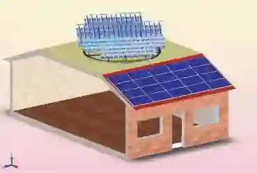 解决生活用电的最佳方案是"屋顶光伏发电+锂离子储能电池"组成的"微电网". 我国约有100亿平方米的屋顶, 广大农村约有全部屋顶面积的70%—80%. 正在发展中的第三代光伏发电技术已做到每平方米能发出50W 的电力,其等价于不跟踪太阳的平板电池的"等效"峰值功率的组件售价,已下降到15—16元/W.80亿平方米的屋顶面积,可安装约4亿千瓦的电力. 以年平均发电1500小时计,4亿千瓦将发出6000 亿度电能. 以10 亿农村人口计,可实现人均供应600度电. 这将完全满足农村各住户照明、电器、空调……用电,节余的电可输往"小电网". 图 1 为安置在屋顶的一个可"供热 + 供电"转盘示意图.