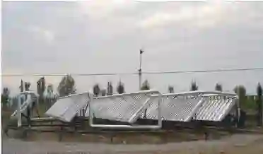 陈式定日镜的特点是:不论太阳自晨至晚,从冬到夏,这一定日镜能自动地在时间、空间分布上较均匀地将太阳光反射到某一由"小塔"所支撑的某一"集热面"上. 图3是陈式定日镜和小塔支撑的集热面的照片.