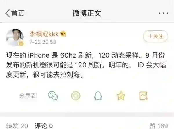 李楠微博爆料称,现在的iPhone是60Hz刷新率、120Hz动态采样,9月份发布的机器很可能是120Hz刷新率。至于明年,(iPhone设计)ID会大幅度更新,很可能去掉刘海。目前,该爆料微博已删除。