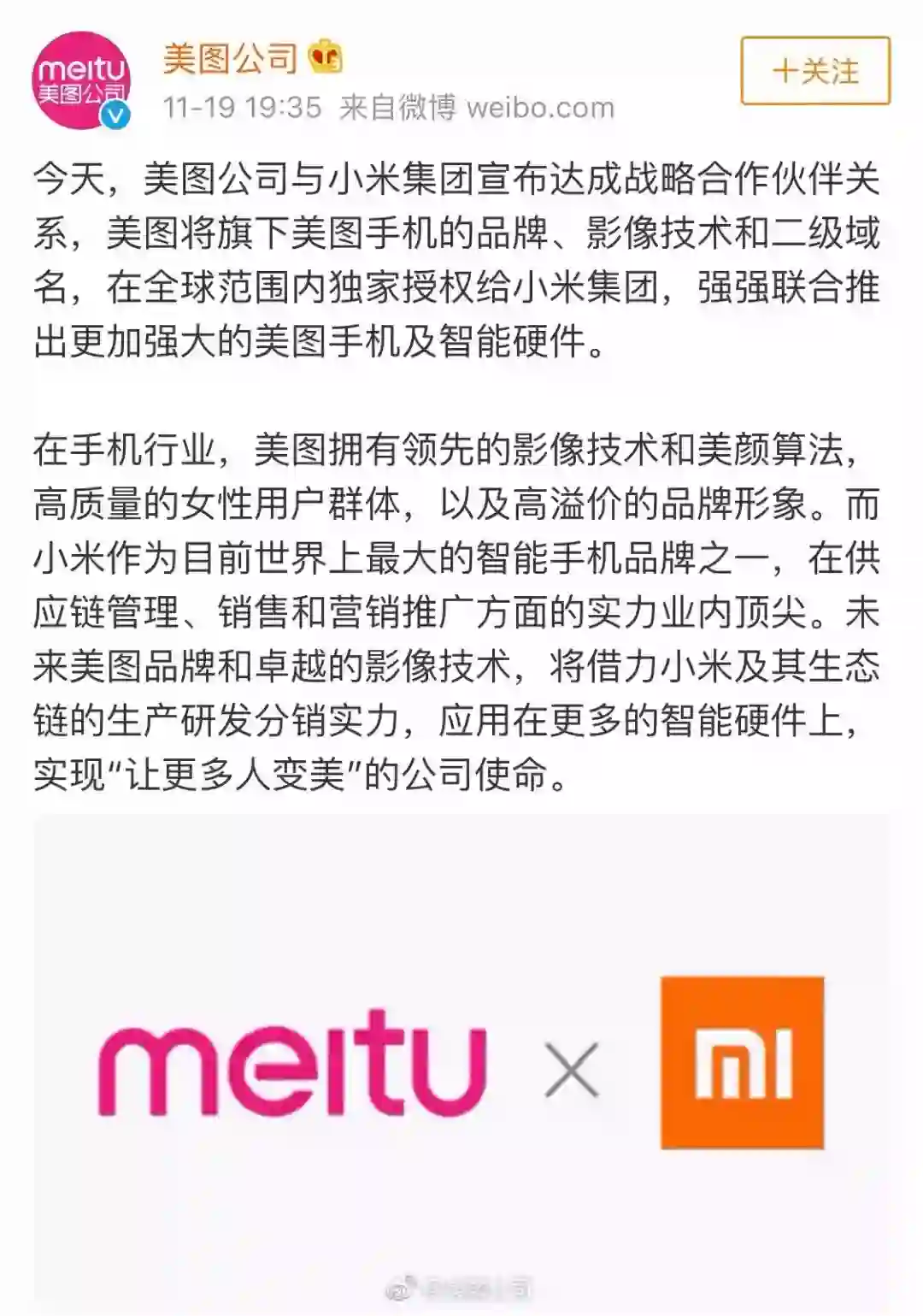 美图公司与小米集团宣布达成战略合作伙伴关系,将联合推出更加强大的美图手机及智能硬件。根据合作内容,美图将旗下美图手机的品牌、影像技术和二级域名,在全球范围内独家授权给小米集团。