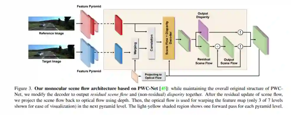 场景流估计在三维环境感知中越来越受到重视。单目场景流估计是一个高度不适定的问题,目前缺乏实用的解决方案。单目场景流估计是从两个时间上连续的图像中获取三维结构和三维运动。我们提出了一种新的单目场景流算法,该算法具有较强的精度和实时性。采用逆问题观点,我们设计了一个单独的卷积神经网络(CNN),它可以成功地从一个经典的光流成本体积同时估计深度和三维运动。我们采用带有三维损失函数和遮挡推理的自监督学习来利用未标记的数据。我们验证了我们的设计选择,包括代理丢失和增加设置。我们的模型在单目场景流的无监督/自监督学习方法中达到了最先进的精度,并在光流和单目深度估计子任务中获得了具有竞争力的结果。半监督微调进一步提高了精度,并在实时产生有希望的结果。