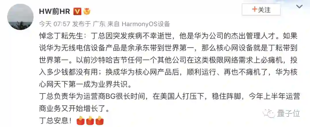 丁耘先生在华为兢兢业业工作了26年,为公司的成长和发展做出了重大贡献,我们对他的不幸病逝表示深切的哀悼!请大家聚焦工作,化悲痛为力量。