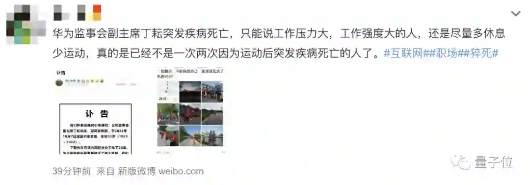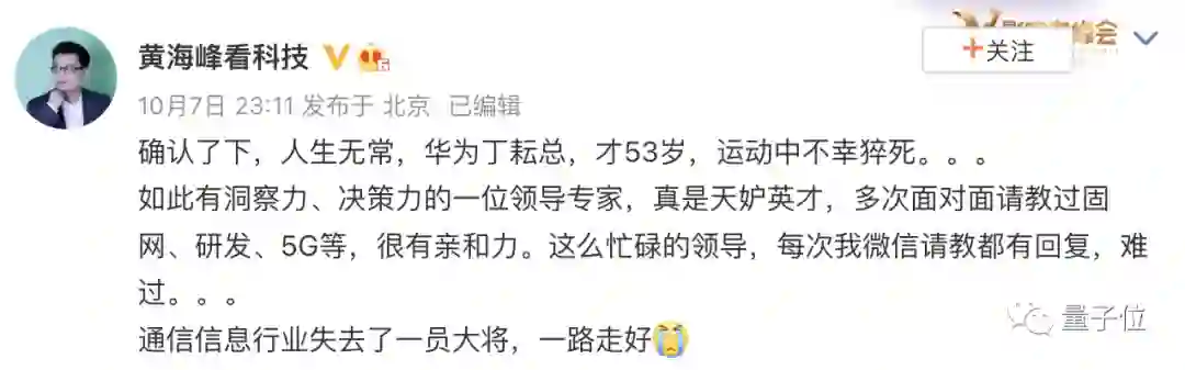 华为讣告中,也表达了对丁耘离世的痛心:
