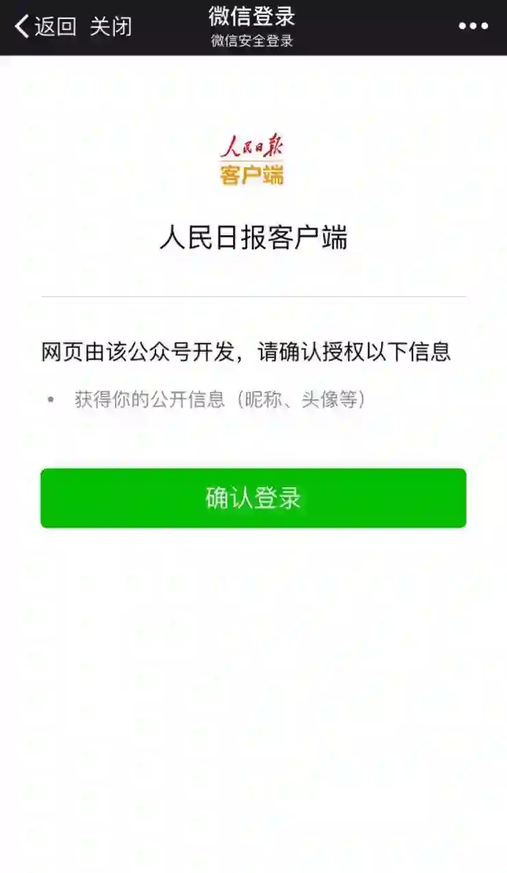 首先,我们可以观察到,在确认授权人民日报客户端的信息中主要包括个人昵称和头像等,这些信息似乎并非个人隐私信息。
