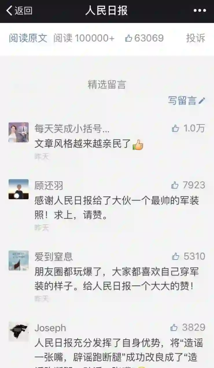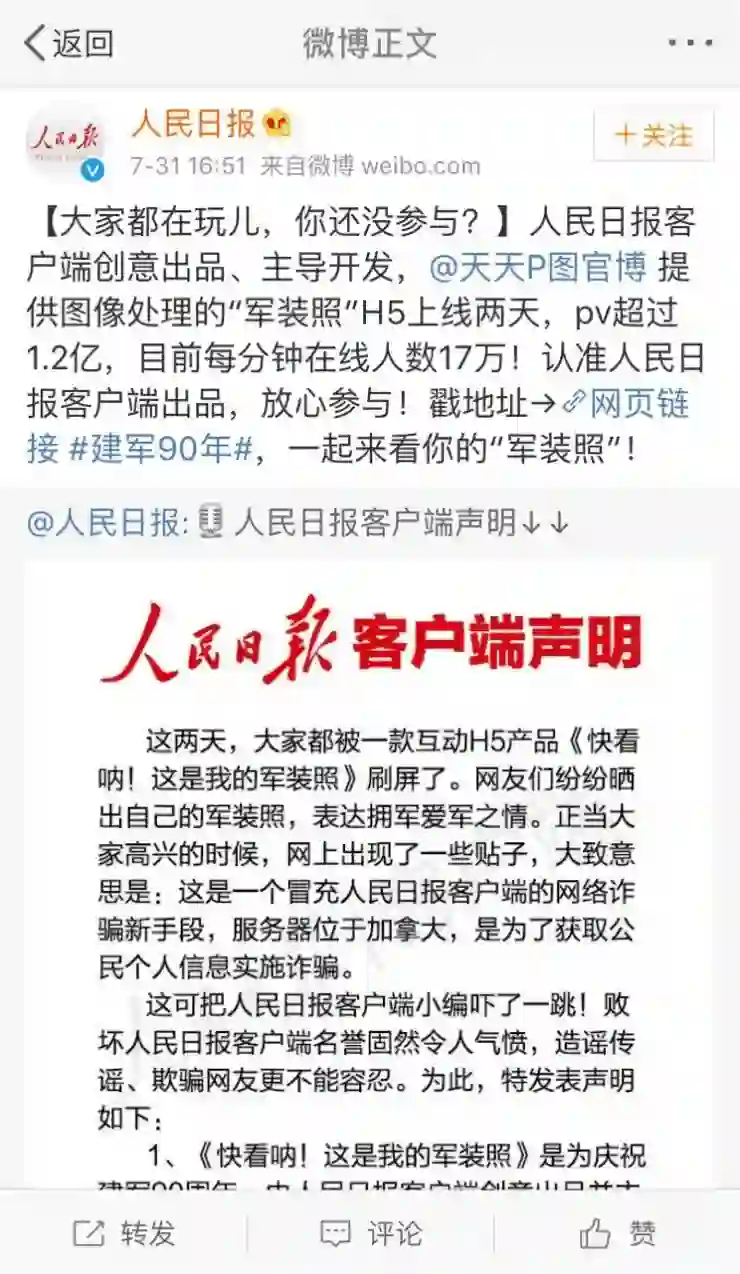 随后,在昨天下午16点51分,人民日报转发了客户端声明,告知各位童靴“军装照”H5是由天天P图提供图像处理,鼓励大家放心玩。