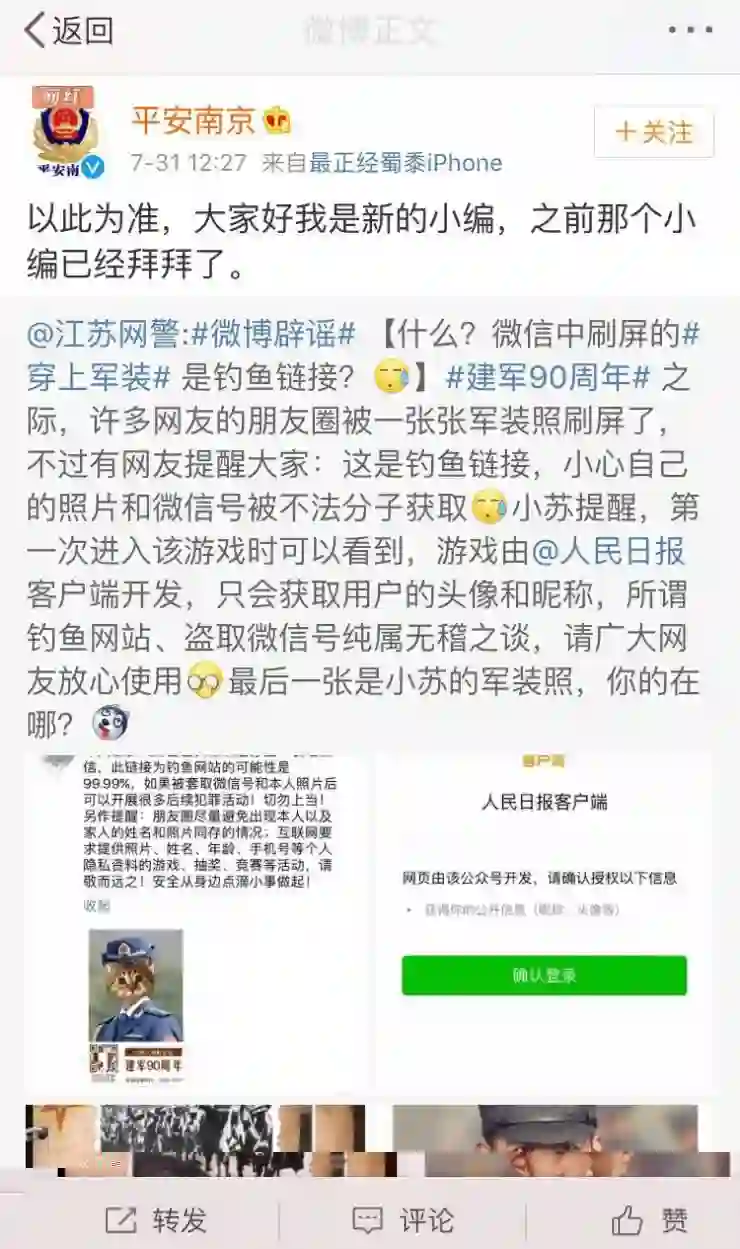 7月30日上午11点46分,@平安南京的一条“揭露电诈新手法”的微博迅速发酵,直指所谓的扫二维码穿上军装其实就是钓鱼链接,目的是获取用户信息。