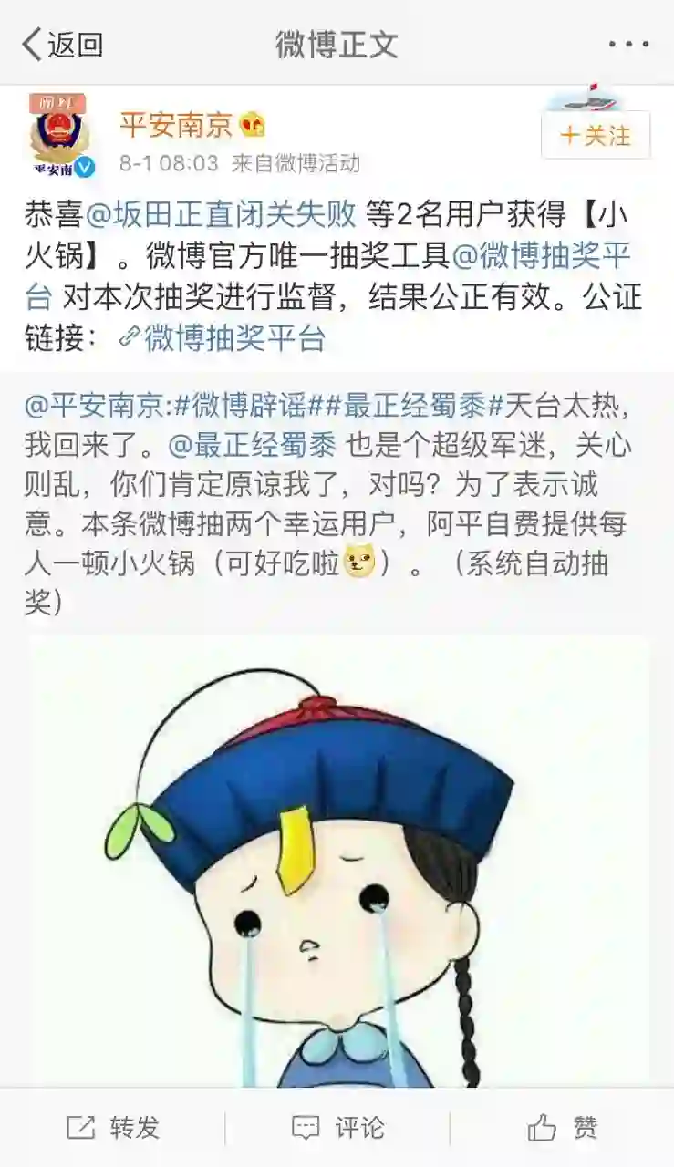 就在这则微博发出前,平安南京先一步发出转发抽奖的微博,奖品还是......一顿小火锅???