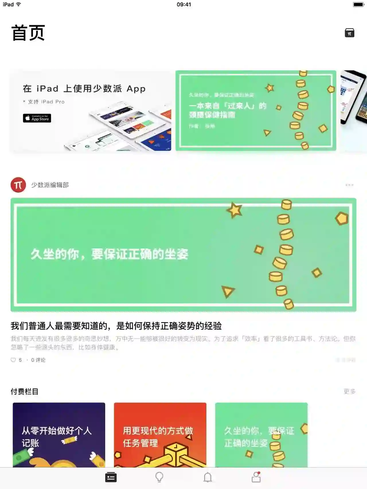 作为通用版本,iPad 上的功能和目前 iPhone 版完全一致,你可以阅读少数派每日最新文章,对文章进行评论、点赞、收藏、分享,可以浏览 Matrix 社区的精选内容,可以发现针对不同场景、需求的专题合集,也可以接收站内通知或私信。此外,最新推出的付费栏目你也可以在 iPad 上购买、阅读,或评论参与互动。