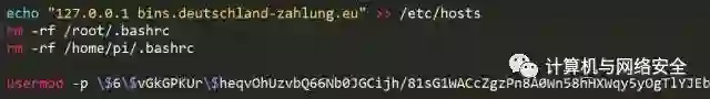 3、将一个可疑地址加入到/etc/hosts,将本地地址解析到bins.deutschland-zahlung.eu删除shell设置的环境变量,并且改掉pi用户的密码信息。