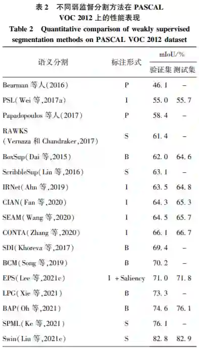 2)针对语义分割任务,根据不同粒度的弱监督形式,如边界框标注、图像级类别标注、线标注或点标注等,对语义分割研究进展进行总结分析。