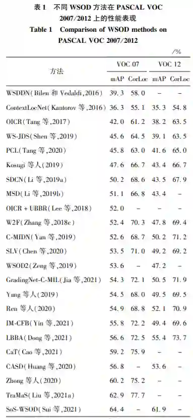 1)存在的问题和挑战。相对于全监督学习,视觉弱监督学习由于仅依靠弱标注,因而会面临局部聚焦,难以准确地挖掘出所有的物体和精确地定位物体。如何进一步缩小视觉弱监督学习与全监督学习的性能差异,并将其进一步应用于实际的视觉理解应用,仍然是未来视觉弱监督学习研究中亟待解决的问题。另外,当视觉弱监督学习应用于开放动态环境时,标注噪声和异常样本往往难以避免。如何利用开放环境的大量未标注数据或噪声数据,并有效抑制异常样本的不利影响,是视觉弱监督学习研究走向应用的过程中亟待解决的挑战。此外,弱监督学习并不是降低标注成本的唯一方式。视觉弱监督学习如何在与其他低标注成本学习方式的竞争中脱颖而出,或者结合其他方式形成更为有效的低标注成本学习解决方案,仍然是一个值得深入研究的问题。